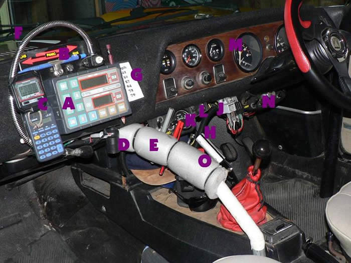 A - Terratrip, accurate, programmable distance measuring device. Air horn button beneath Terratrip for co-driver’s use.